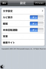 設定では、ルビ表示のオン/オフ、縦組、本体回転連動、背景画像、検索サイト指定(このデモアプリの場合はGoogleのみ)などを行う事が出来ます。