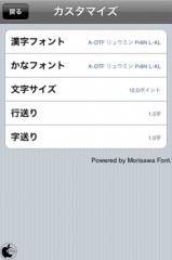 文字設定では、文字表示サイズを、小/中/大の三段階に切り替える事ができ、さらに右上のカスタマイズを選択すると、漢字フォント、かなフォント、文字サイズ、行送り、字送りなどを設定することが出来るようになっています。