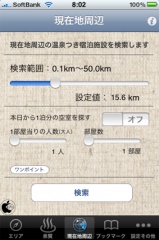 GPS機能を利用した現在地情報を元に、周辺の温泉つき宿泊施設検索を行うことが出来ます。