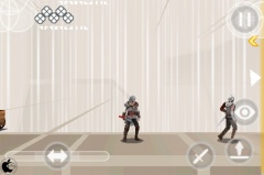 ここは、左のオレンジ色の矢印が右を向いていると、敵がアサシン側を向いていないという状態で、目のアイコンをタップして、忍び足で敵に近づいて倒す方法を学ぶ場面だと思って下さい。