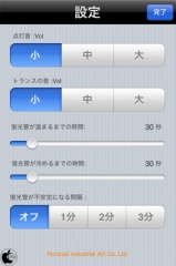 画面をダブルタップすると設定画面が表示され、点灯音、トランス音の音量調整や、蛍光灯が点くまでの時間が設定出来ます。