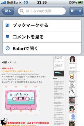 気になる記事をタップすると、該当ページがアプリに内蔵されたブラウザーで表示され、画面右上のB!ボタンをタップすると、ブックマークやコメントを追加することが出来ます。