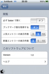 設定をタップすると、該当ページをSafariで開いたり、ブックマーク数取得のオン/オフ、人気エントリー数の表示件数などを変える事が出来るようになっています。