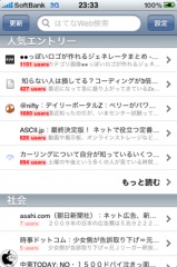 すでに、iPhoneのSafariに最適化された「はてなブックマーク for iPhone」が公開されていますが、iPhoneアプリ版では、起動すると、人気エントリー、社会、政治・経済、生活・人生、スポーツ・芸能・音楽、科学・学問、コンピュータ・IT、ゲーム・アニメ、おもしろ、新着iPhoneアプリのカテゴリーに分かれて、人気エントリーが表示されるようになっています。