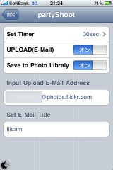 必ず、アプリを起動する前に、初回だけ、iPhone OS>設定>PartyShootのアップロードメールアドレスや、メールタイトルを設定します。