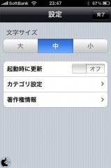 設定では、表示フォントサイズ(3段階)の切り替え、読み込むカテゴリー選択などが出来るようになっています。