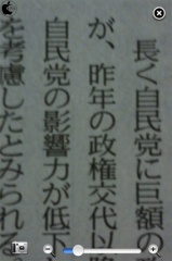 画面をピンチ操作するか、画面下のスライダーを操作することで、新聞などの文字を拡大して読む事が出来ます。