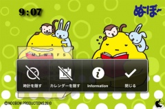 アプリを起動すると、ぬ〜ぼ〜のイラストが表示され、その上に時計とカレンダーが表示されます。