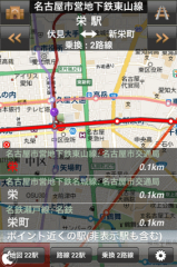 名古屋市の地図を拡大表示して、栄の駅をタップすると、現在選択されている路線情報が下に表示され、前後の駅が上に表示されます。