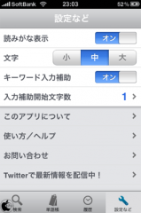 設定をタップすると、読みがな表示のオン/オフ、文字サイズ、キーワード入力補助のオン/オフなどを行う事が出来るようになっています。