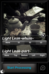 LightLeakボタンをタップし、光量と光が漏れる位置を指定し、Start Processingボタンをタップします。