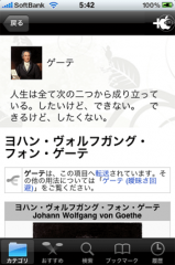 読みたい格言をタップすると、格言全文と、その偉人に関するウィキペディアが表示されます。