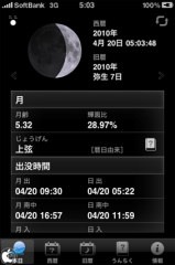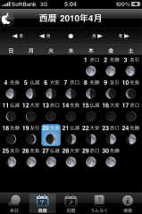 西暦タブをタップすると、月の日毎で移り変わる月の満ち欠け状態を見る事が出来ます。