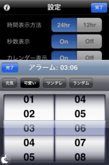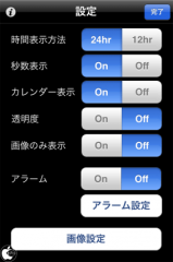 画面をダブルタップすると、設定画面が表示され、時間表示方法、秒数表示、カレンダー表示、透明度、アラームなどのオン/オフを行うことが出来ます。