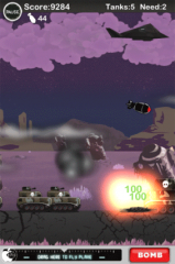 ゲームをスタートしたら、画面右下のBOMBボタンをタップして、爆弾を投下して、下を走る軍用車を破壊します。
