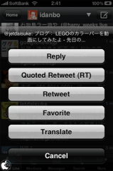 任意のツイートを長押しすると、返信、引用付きRT、公式リツイート、お気に入り、翻訳のボタンが表示され、アクションすることが出来ます。
