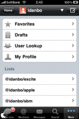 Moreタブでは、お気に入り、ユーザー情報、リスト表示などを行う事が出来ます。