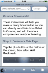 Moreで、ブックマークレットを使う事で、iPhoneのSafariを開いた状態で、ブックマークに登録したOsfooraブックマークレットを選択すると、開いているサイトのURLを新規ツイート入力欄に転載することが出来ます。