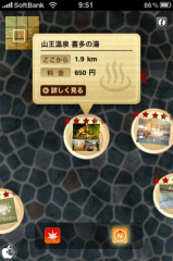 表示されている温泉情報をタップすると、詳しい温泉情報と、現在地からの距離と方向を示してくれます。