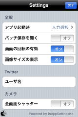 設定には、バッチ処理の保存、画面の回転、サイズ表示などの設定などに加え、Twitterに投稿するためのTwitterアカウント入力などが用意されています。