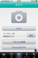 カメラをタップすると、iPhoneのカメラで撮影したり、写真ライブラリーの写真や動画をアップロードすることが出来ます。