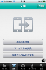 交換をタップすると、Bluetooth接続で、quanpアプリ同士で、連絡先を交換したり、プレイスのファイル、写真ライブラリーの写真を交換することが出来ます。