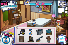 掃除道具を使って部屋やお風呂場、キッチンなどを掃除していきます。