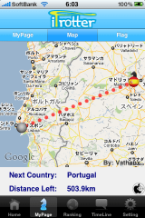 MapタブからiTrotter上での現在の自分の位置をGoogleMap上で確認したり、次に向かっている国とその残り距離を見ることができます。