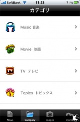 カテゴリーをタップすると、音楽、映画、テレビ、トピックスのジャンルで絞り込みが出来ます。