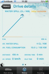 運転を終了すると、水がこぼれた量と燃料消費量と共に、移動した距離と、水がこぼれた地点がGoogle マップで表示されます。