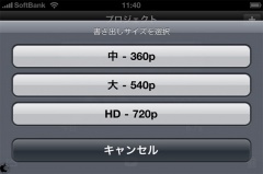 編集作業が終了したら、プロジェクト選択ボタンをタップし、プロジェクトを選択し、左下のアクションメニューをタップすると、中(360p)、大(540p)、HD(720p)の3つのサイズで写真ライブラリーにレンダリングされて保存が行われます。