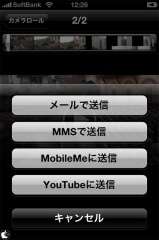 写真ライブラリーに保存された動画を選択し、アクションボタンをタップすることで、メール、MMS、MobileMe、YouTubeに送信することが出来ます。