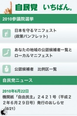 2010年06月27日(日) iPhone App Store#iPhone#iPod_touch#自民党アプリ 自由民主党の広報アプリ「自民党アプリ」をリリース ※本サイトは、アフィリエイト広告および広告による収益を得て運営しています。購入により売上の一部が本サイトに還元されることがあります。 自民党アプリ 自由民主党が、iPhone/iPod touch用自民党アプリ「自民党アプリ」を、App Storeにて無料配付を開始しています。 自由民主党のマニフェストや、各地区の候補者情報を閲覧することが出来るアプリです。 注:起動してから、画面が表示されるまで2〜3分ほど掛かるようです。 政策パンフレットや、自民党ニュースなどを読む事が出来ます。 また、地域の公認候補者情報や、ローカルマニフェストなども読む事が出来るようになっています。 ↓の評価ボタンを押してランキングをチェック!