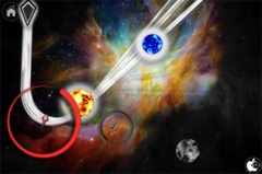 画面上にある矢印を囲んだ丸を使って光の線を曲げて、全ての惑星を輝かせる事が出来ると1面クリアとなります。