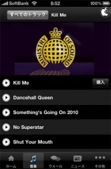 音楽タブをタップすると、再生曲リストが表示され、好きな曲から再生することや、曲を購入したり出来ます。