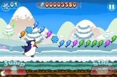 ゲームをスタートすると、ペンギンが走り出すので、左のジャンプボタンか、右のスライディングボタンをタップして、画面上に表示されるアイテムを獲得し続けます。
