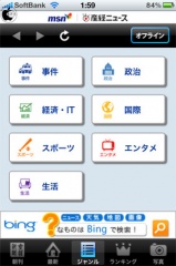 ジャンルをタップすると、事件、経済・IT、スポーツ、生活、政治、国際、エンタメのジャンルボタンが表示されます。