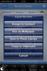 写真ライブラリーなどに書き出しを行う場合は、My Kimsフォルダから写真を選択し、Exportボタンをタップして、写真ライブラリー、壁紙設定などのボタンをタップすることで行えるようになっています。