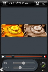 FXボタンをタップすると、必要タブのカラーエフェクト、白黒、セピア、ライトセピア、ネガフィルム、ビグネット、ワイドスクリーンに加え、明るさ/コントラスト、バイブランス/飽和、露出の調整フィルタが選択出来ます。
