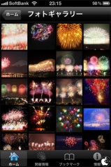 フォトギャラリーをタップすると、各地の花火写真がタイル表示されます。