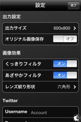 設定をタップすると、出力サイズの変更、くっきりフィルタ、あざやかフィルタのオン/オフ、レンズの絞り形状などを変更することが出来るようになっています。