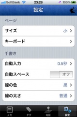 設定をタップすると、ページサイズ、キーボード設定、自動入力の時間設定、自動スペースのオン/オフ、線の色や太さなども変える事が出来ます。