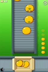 ゲームは、ベルトコンベアーを転がる、ミカンせいじんを指で弾いて外に出し、みかんだけを残してミカン箱に6個詰めるゲームです。