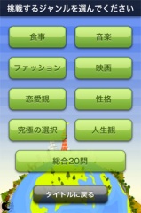 食事、音楽といったジャンルを選択し、出題される20問に回答します。
