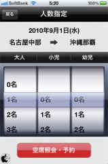 特定の日付をタップすると、人数指定を行って、空席照会を行う事が出来ます。