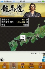坂本龍馬が、土佐を出て京都で暗殺されるまでの間に移動した距離は、およそ3万km。その距離を一緒に歩きながら、坂本龍馬の人生をトレースするという万歩計アプリです。