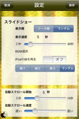 設定では、スライドショーの表示方法や、BGM選択、自動スクロール設定などを行う事が出来るようになっています。