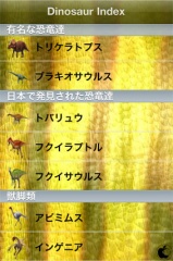 アプリを起動すると、有名な恐竜、日本で発見された恐竜、分類(獣脚類、竜脚形類、鳥脚類、角竜類、周飾頭類、鎧竜類、剣竜類)で、五十音順に一覧表示されます。