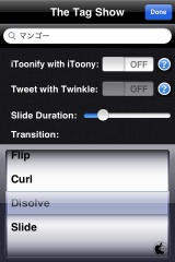 また、iボタンを押すと検索するキーワードの入力と、表示エフェクトの変更が出来ます。さらにStandard Widget Corporationの写真アプリ「iToony」(350円)、TapulousのTwiiterアプリ「Twinkle