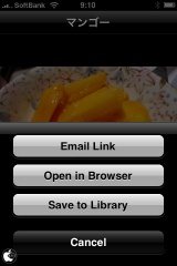 スライドショーの左下のボタンを押すと、実際に画像があるサイトのURLをメールに転送したり、Safariで開いたりすることができ、また画像をiPhone 3Gに保存することも出来ます。